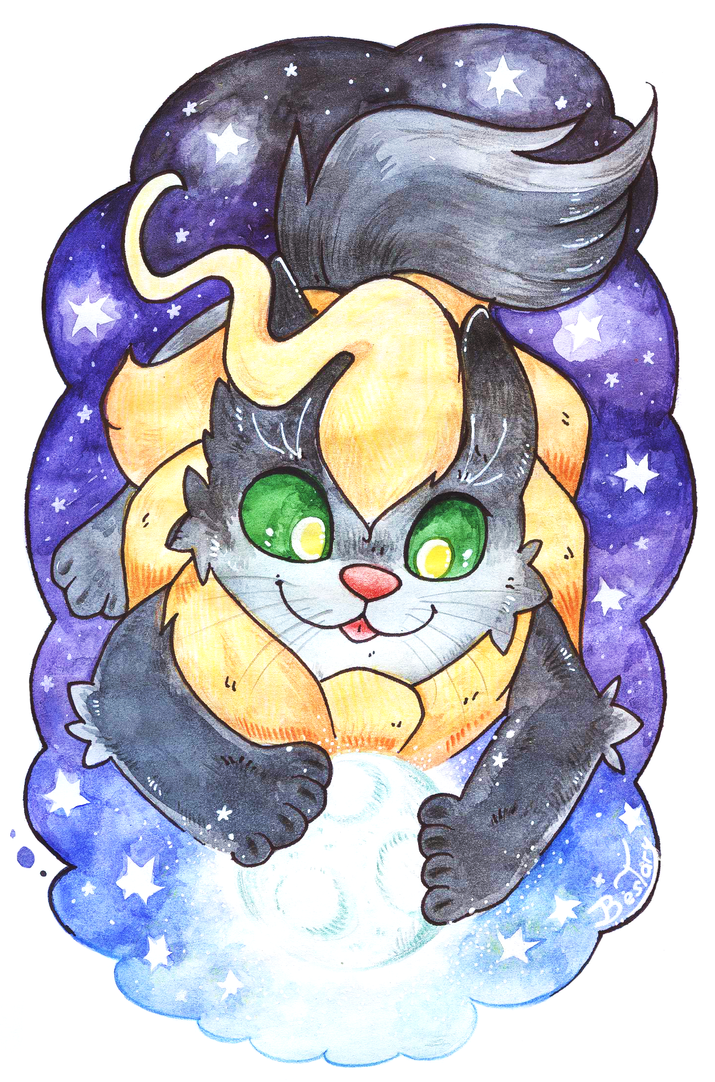 В детстве у меня была большая серая кошка по имени Муся. Мы были с ней очень близки духовно. Когда мне исполнилось 17, её не стало. Я решила поселить её в лучшем из миров, тогда мне известных, коим являлся Фаэтон. Поэтому Бигблэк, несмотря на имя, имеет шерсть серого цвета. :) Имя она выбрала сама. Почему - я пока не знаю.
